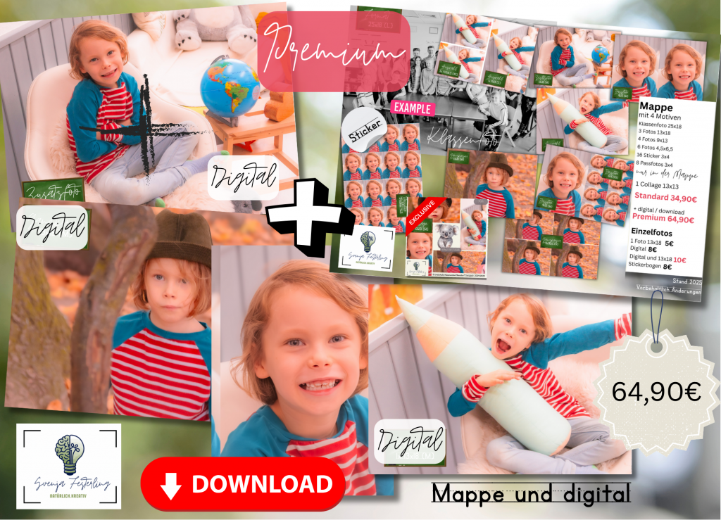 Die Premium-Mappe bietet zu der Basismappe sowie alle 4 ausgewählten Motive zum sofortigen Download welcher direkt nach Zahlungseingang freigeschaltet wird