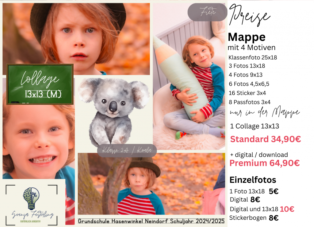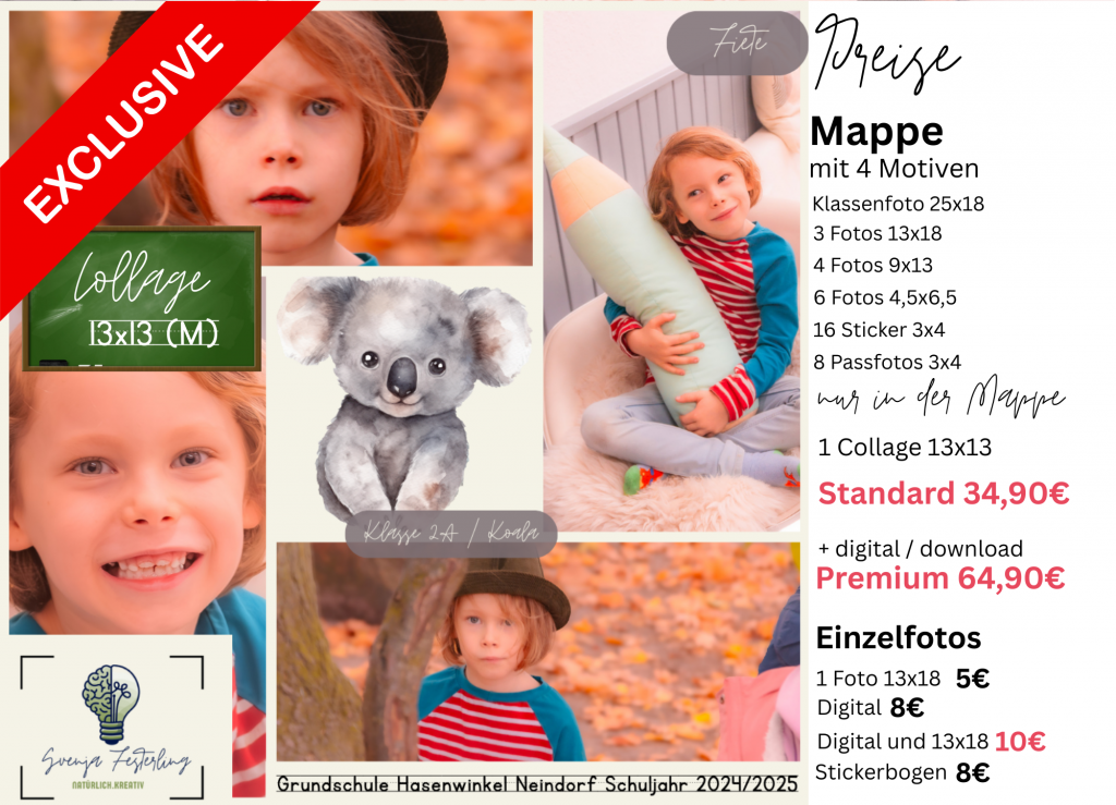 Zu jeder Mappe gibt es eine individuell auf das Shooting von mir abgestimmte und gestaltete Collage (z.B. mit Klassentier)